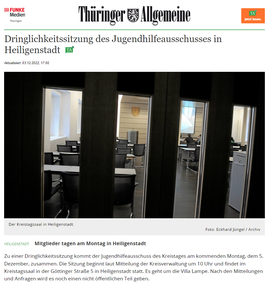 Dringlichkeitssitzung des Jugendhilfeausschusses in HeiligenstadtMitglieder tagen am Montag in HeiligenstadtZu einer Dringlichkeitssitzung kommt der Jugendhilfeausschuss des Kreistages am kommenden Montag, dem 5. Dezember, zusammen. Die Sitzung beginnt laut Mitteilung der Kreisverwaltung um 10 Uhr und findet im Kreistagssaal in der Göttinger Straße 5 in Heiligenstadt statt. Es geht um die Villa Lampe. Nach den Mitteilungen und Anfragen wird es noch einen nicht öffentlichen Teil geben.03.12.2022...